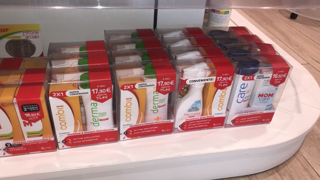 Presso la nostra farmacia è possibile acquistare i prodotti della linea Mom Combi di Candioli Farmaceutici. Le confezioni includono tutte il pettinino, ed è possibile scegliere tra shampoo, emulsione e anche spray per i tessuti. Antiparassitari, questi includono Permetrina, una sostanza attiva utilizzata anche per i presidi medico-chirurgici, che agisce come neurotossina eliminando acari, zecche, pulci e pidocchi.